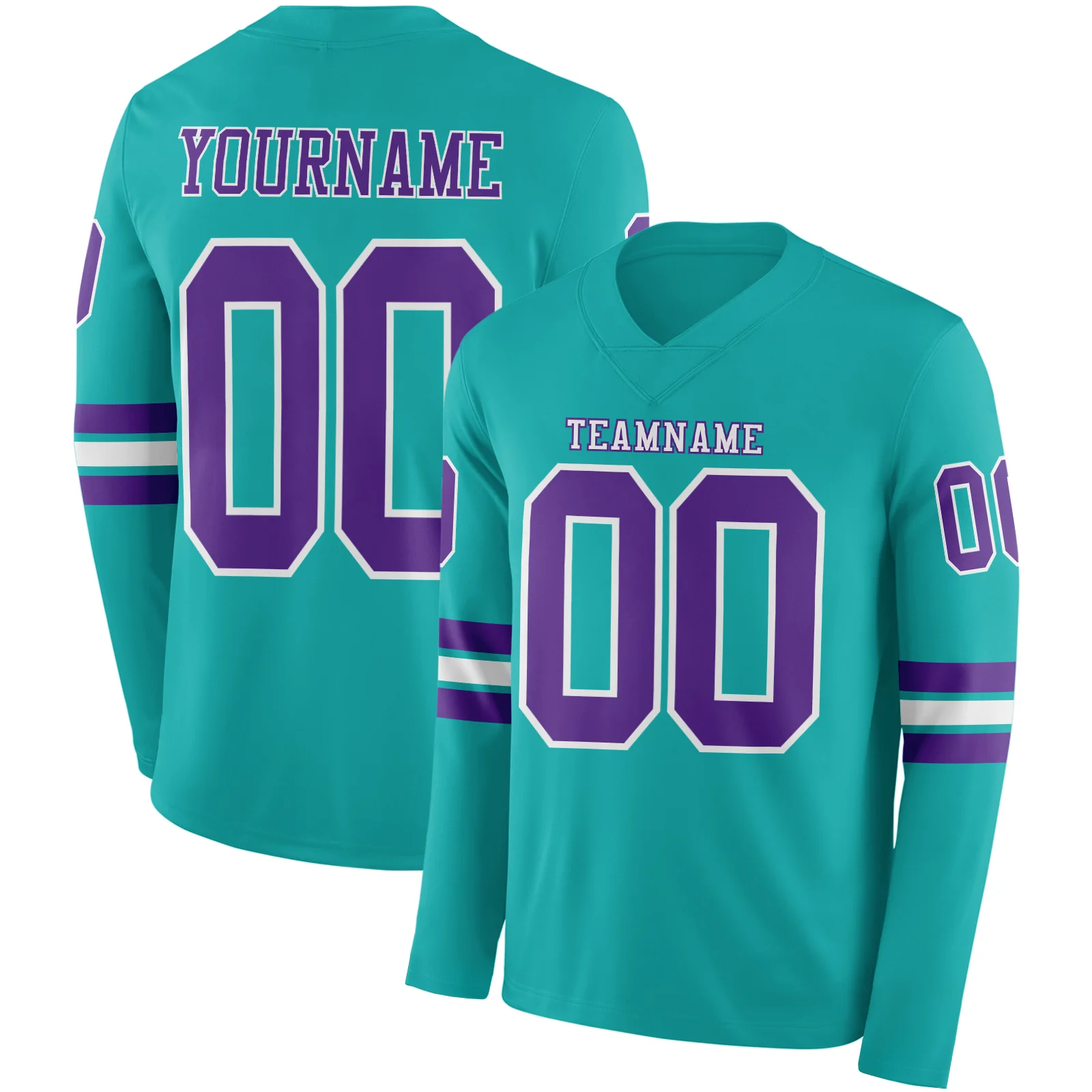 Custom Aqua Purple-White Long Sleeve Authentic Football Jersey