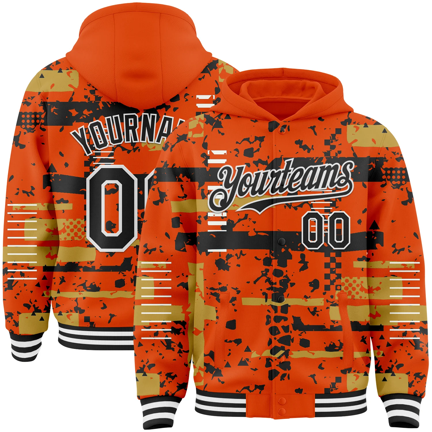 Custom Orange Black Old Gold-White Abstract Fragment Shape 3D Pattern Design Bomber Full-Snap Varsity Letterman Hoodie Jacket