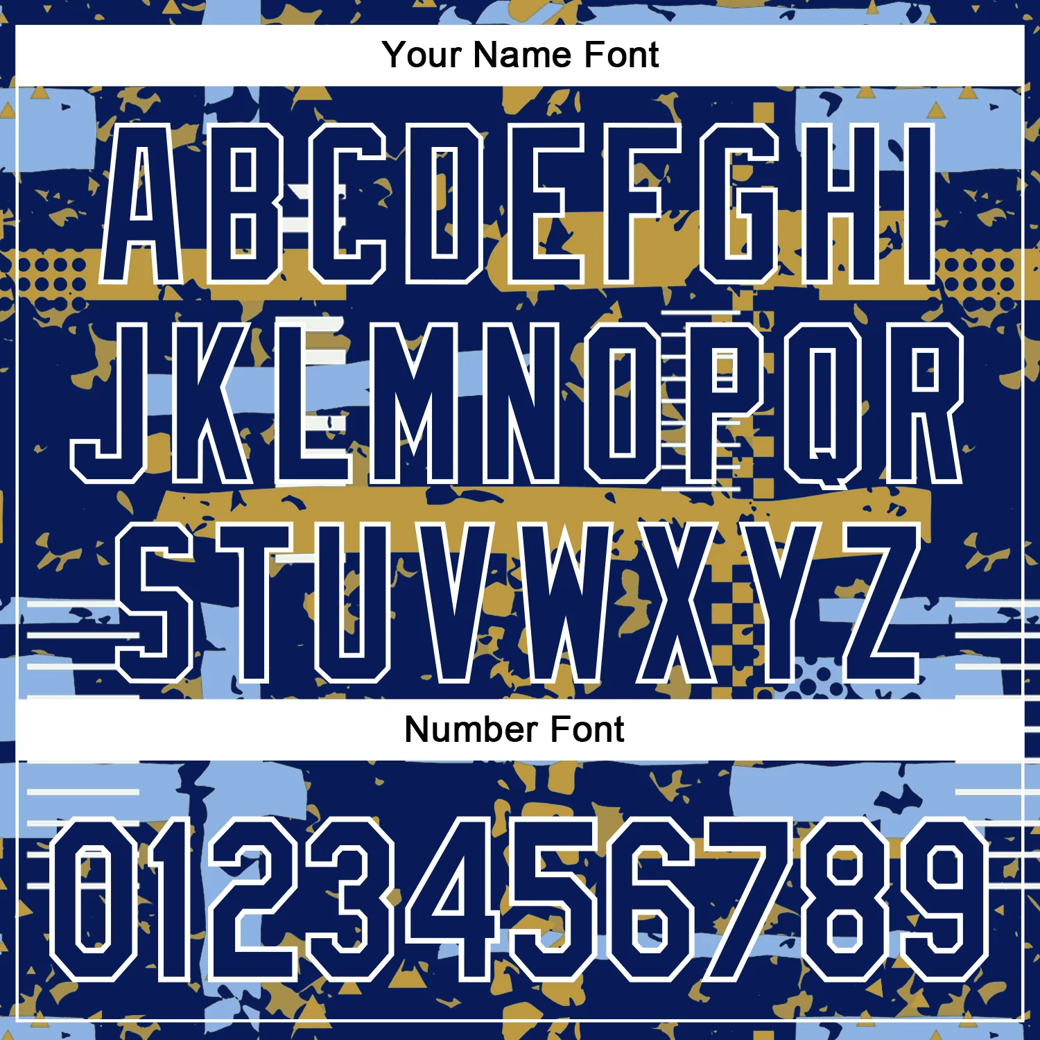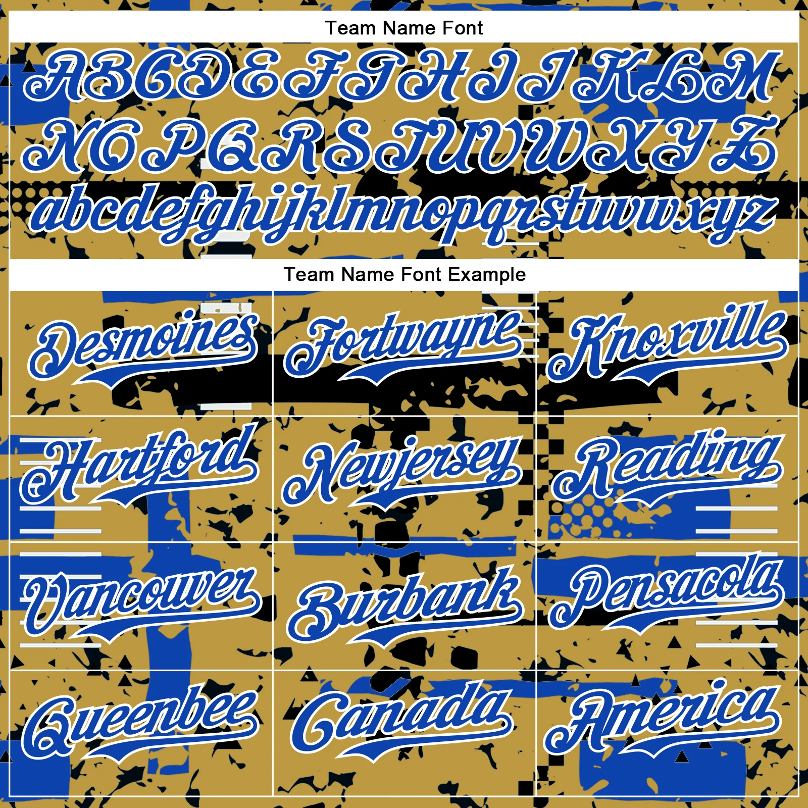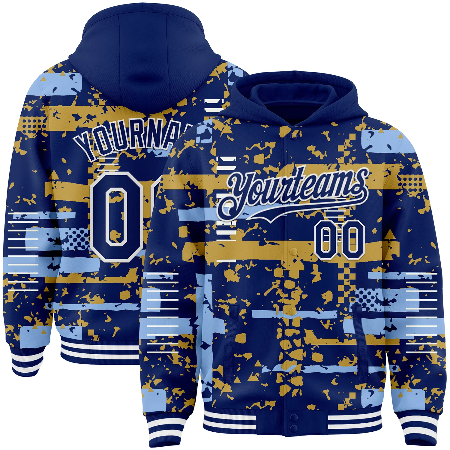 Custom Royal Light Blue Old Gold-White Abstract Fragment Shape 3D Pattern Design Bomber Full-Snap Varsity Letterman Hoodie Jacket