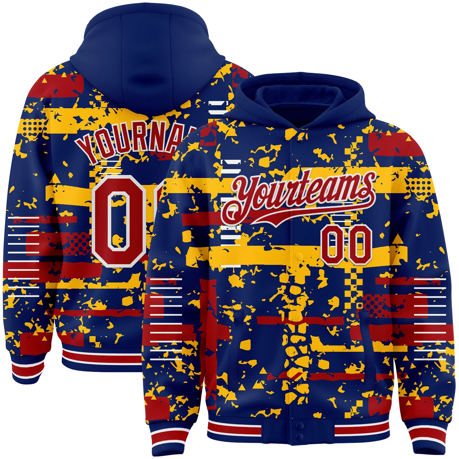 Custom Royal Red Gold-White Abstract Fragment Shape 3D Pattern Design Bomber Full-Snap Varsity Letterman Hoodie Jacket