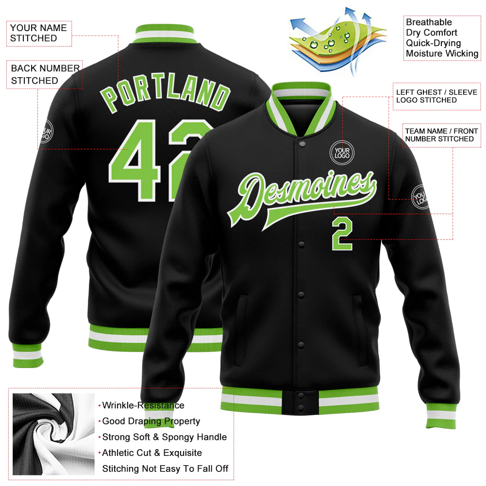 Custom Black Neon Green-White Bomber Full-Snap Varsity Letterman Jacket