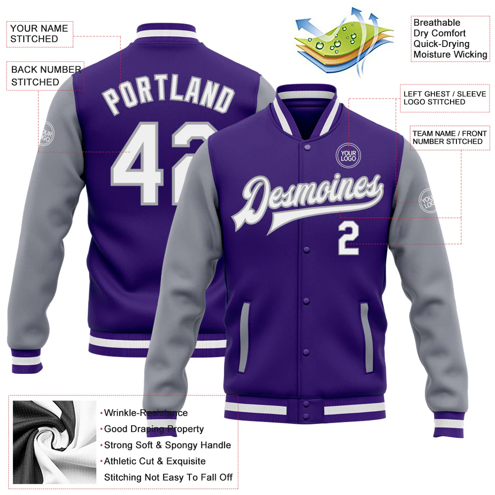 Custom Purple White-Gray Bomber Full-Snap Varsity Letterman Two Tone Jacket