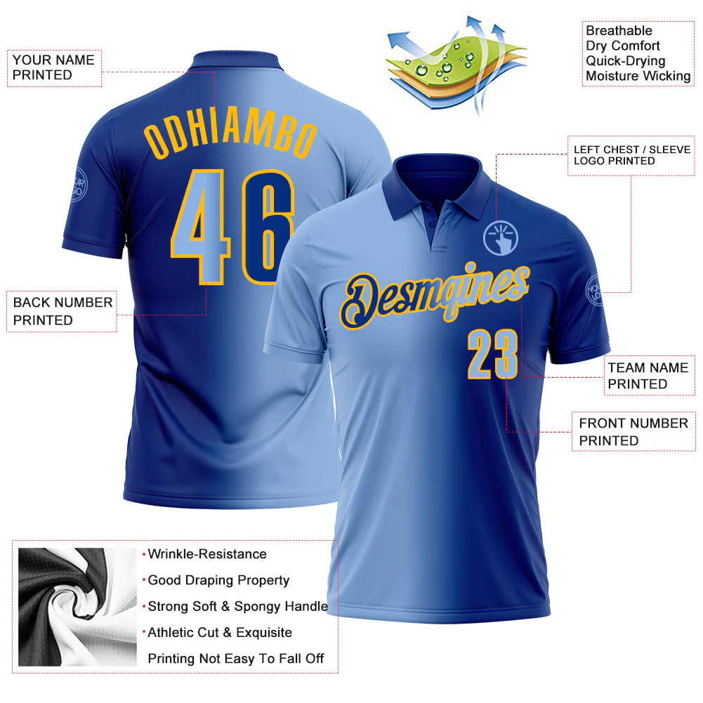 Custom Royal Light Blue-Gold 3D Gradient Fashion Performance Polo Shirt